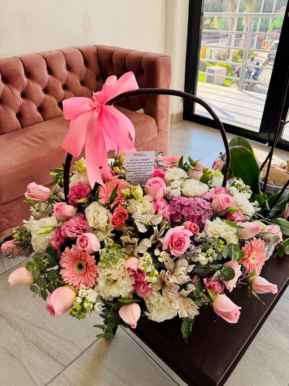CANASTA JUMBO DE ROSAS Y FLORES FINAS CON DETALLES DE LISIAUNTUS Y GERBERAS!
